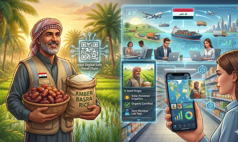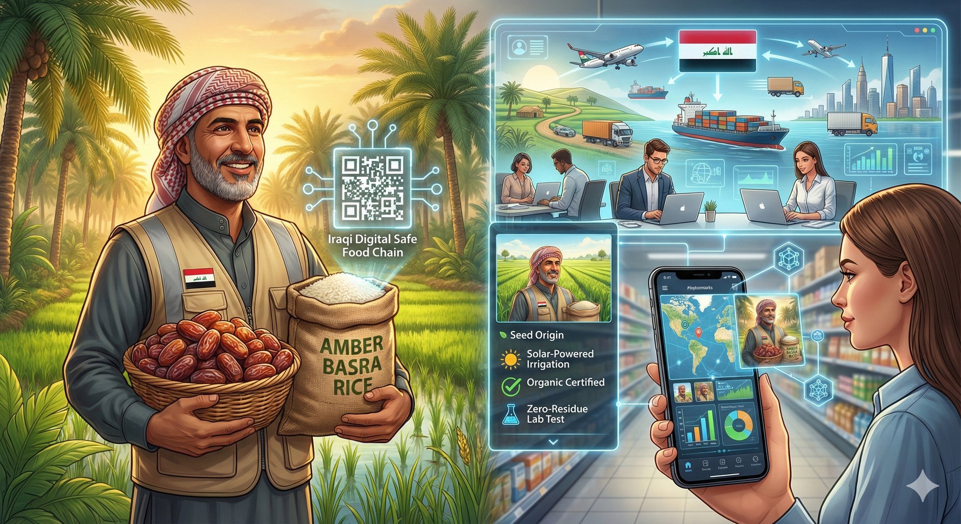 يتيح النظام للمستهلك في أي مكان في العالم مسح رمز الاستجابة السريعة على عبوة التمر أو كيس الأرز العراقي مثلاً ليرى على الفور المزرعة التي أنتجته في الناصرية أو الديوانية، مما يضمن الثقة والقيمة المضافة العالية.